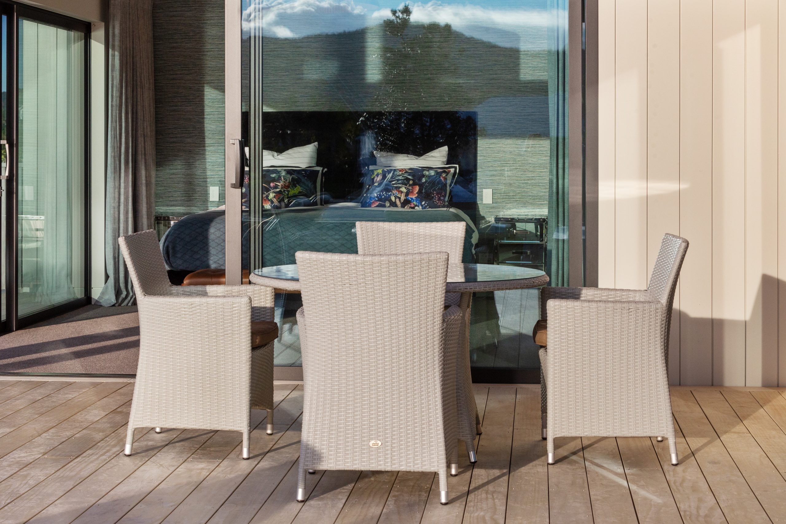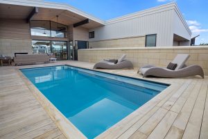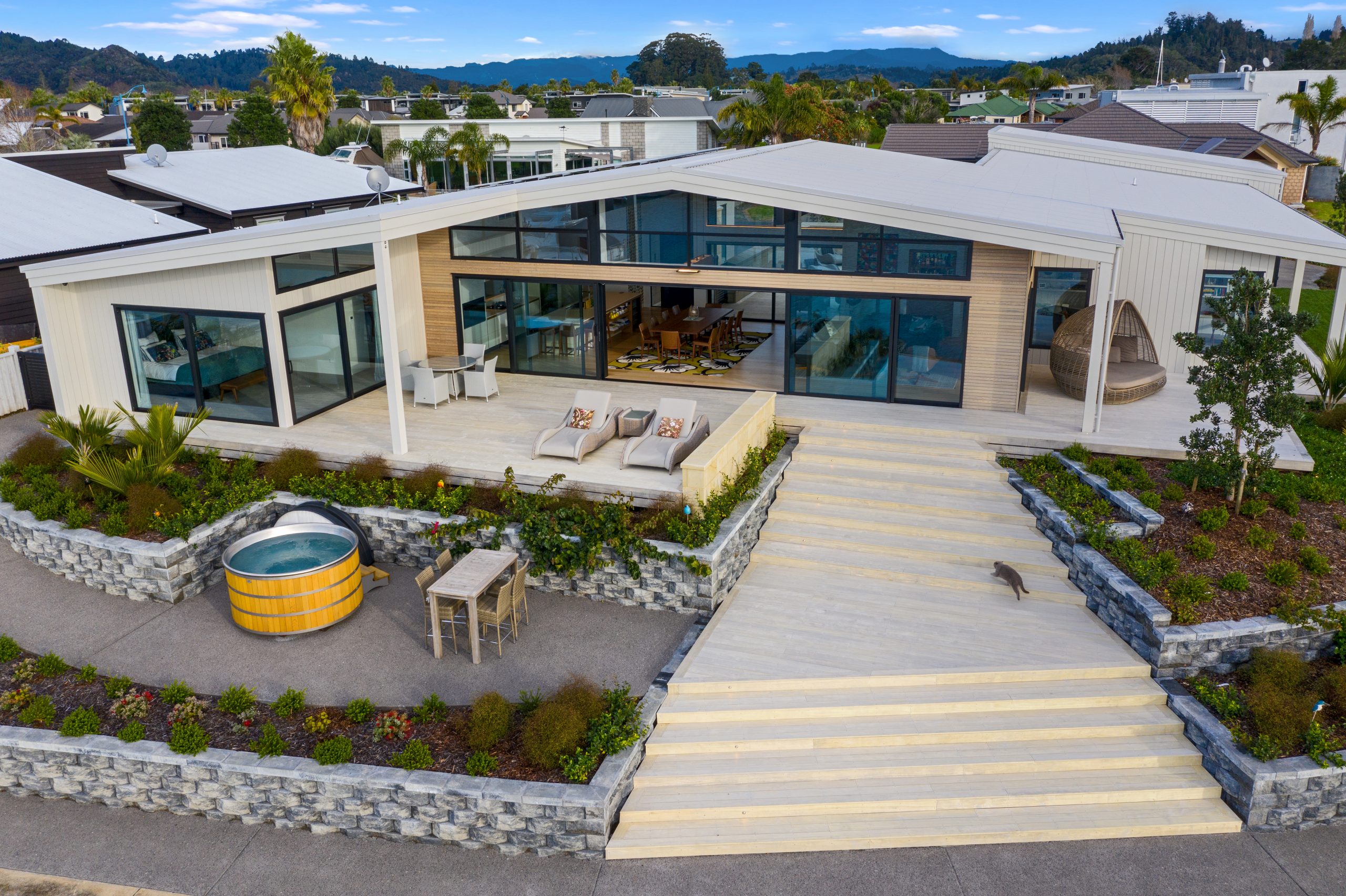 This 477sqm three-bedroom home presides over a double corner section bordered by the canal. You can arrive at the front door by car, or to the entertaining area by boat. The Hinuera stone, weatherboard and cedar-clad house wraps an in-ground pool in a central courtyard. Inside you’ll find more solid timber – floors, kitchen features and built-in oak furniture. The TV lounge has an added bonus: a king-size guest bed that disappears into built-in cabinetry. The three bathrooms have handmade concrete basins and brushed-oak cabinets. As if that’s not enough, the house opens to decking on two canal fronts and has a hot tub on the lower level. Sustainability was high on the owners’ list, so you’ll find solar panels, which heat the home as well as the pool in summer. Batteries store the energy so they can live off the grid. There are electric-car chargers, FSC-certified wood and the double glazing is low-e and argon-filled for cool summers and warm winters. This home is more than just a dwelling; it’s a statement of luxury, comfort, and sustainability.