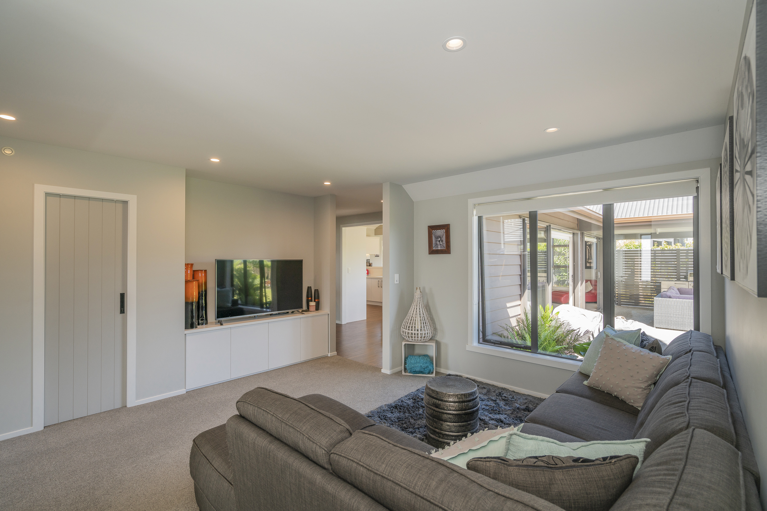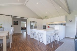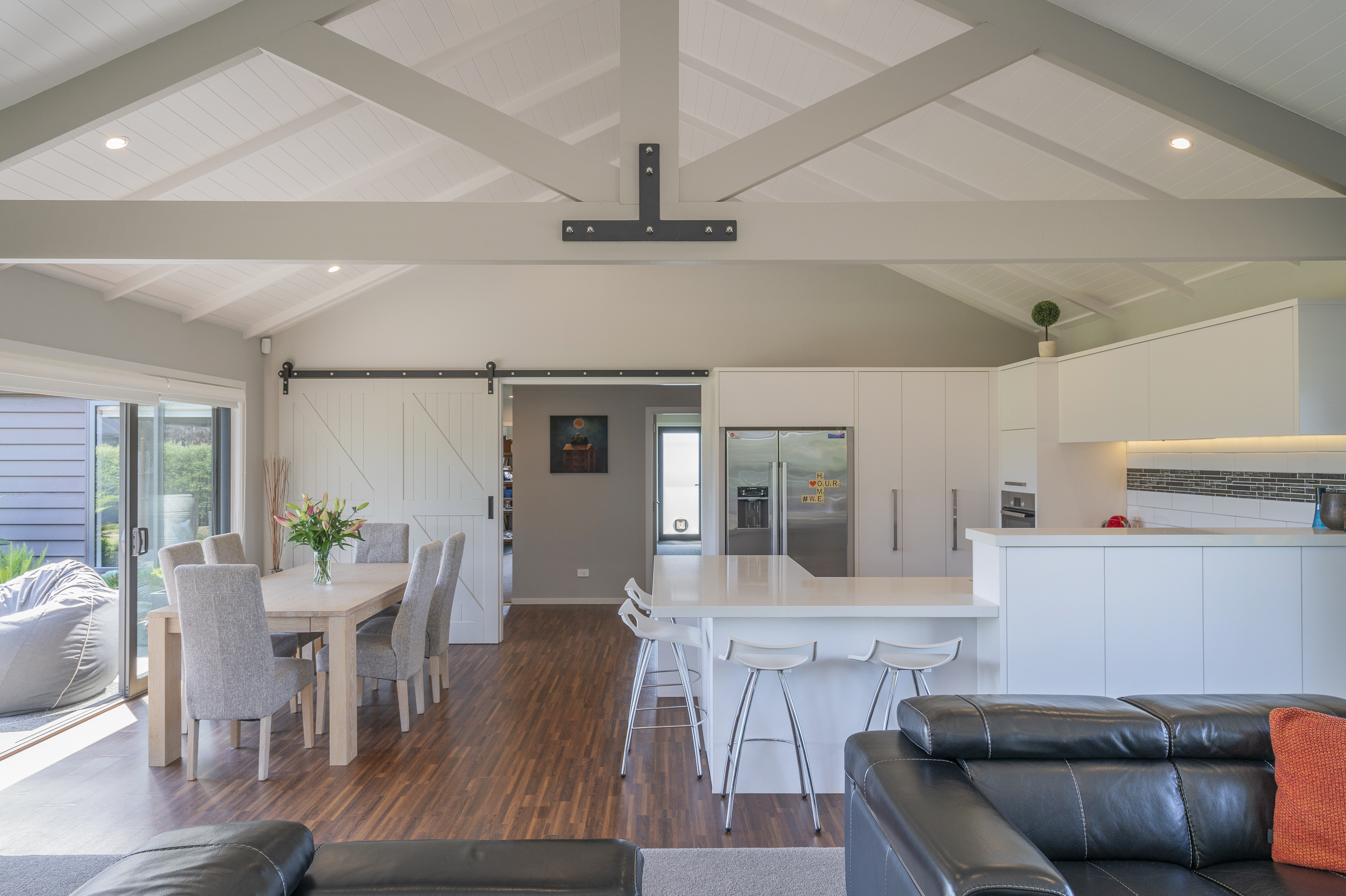 Our New Chum design was recreated on this 922m2 right of way section on the “Top” of Endeavour Island in Topping Place. Our clients were after a more rustic look, with covered outdoor living, so we created a large country style portico out off the living room, with exposed timber trusses and huge laminated posts. This then had a large stainless steel outdoor kitchen installed which made BBQ’s an all rear round possibility. The main living area also had a feature timber truss and barn door added, to set it out from the rest when this style of home was only just becoming on trend.